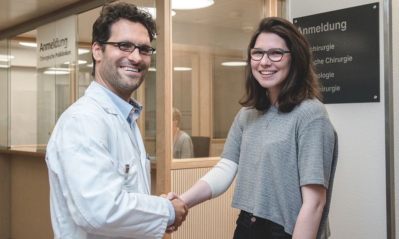 Der lebensgefährliche Unfall geschah vor zwei Jahren: Auf dem Weg zur Arbeit wurde die 16-Jährige am Bahnhof von einem heranrollenden Zug erfasst und schwer verletzt. Der rechte Arm war fast vollständig vom Oberkörper abgetrennt. An diesem Tag hätte sie ihre Lehre als Pharma-Assistentin beginnen sollen. Die Patientin wurde von der Schweizerischen Rettungsflugwacht Rega ins Inselspital geflogen. Dort entschieden sich die Ärztinnen und Ärzte, den Arm der jungen Frau so umfassend wie möglich wiederherzustellen (Replantation).